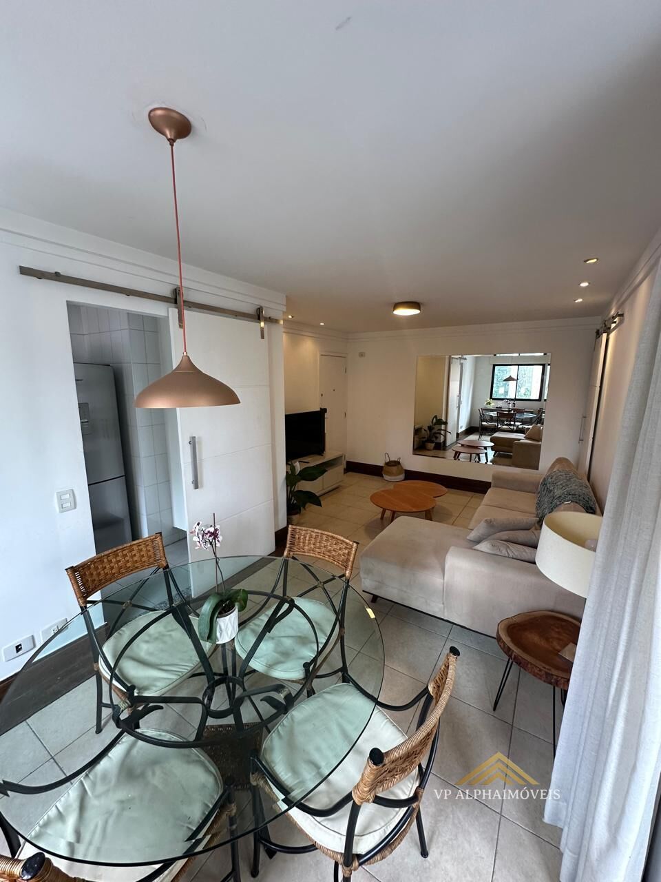É um imóvel de 82 m2 de área útil, com 2 dormitórios, sendo 2 suítes, e 3 banheiros.