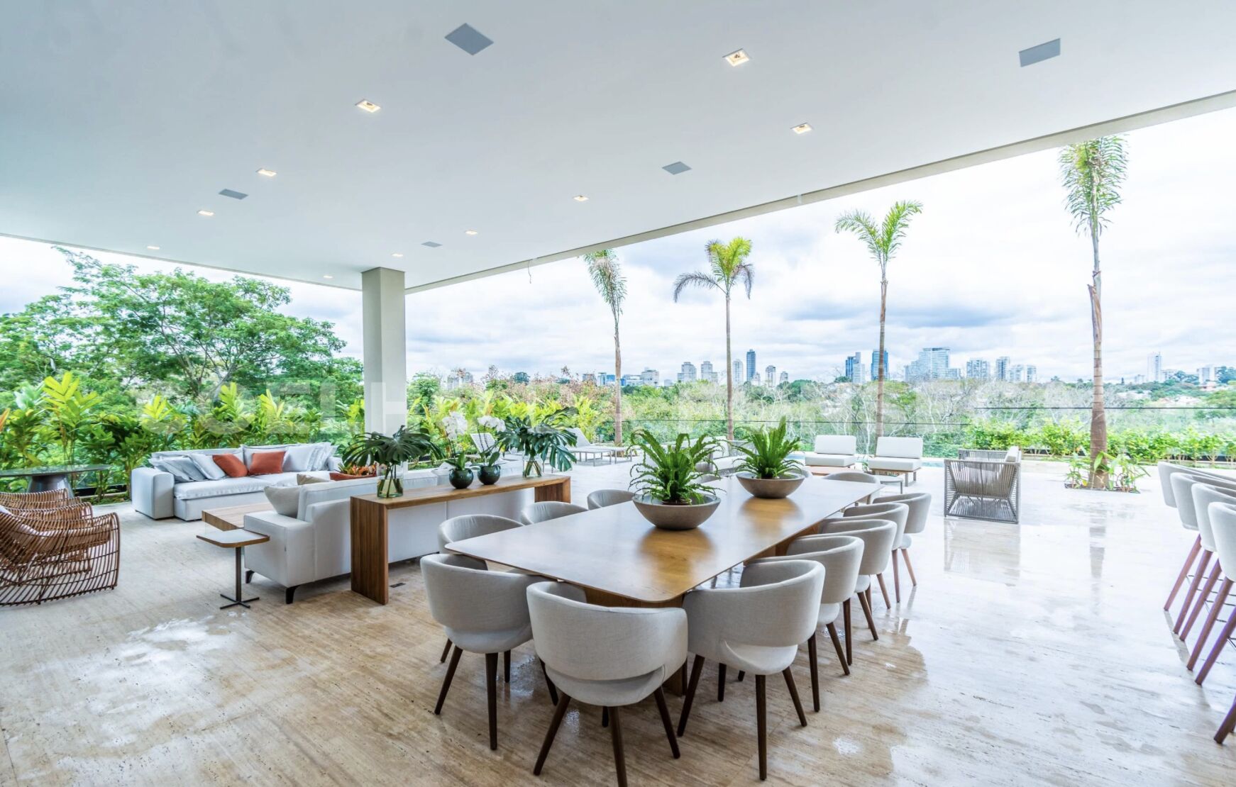 sala íntima, pé direito alto, amplo living com lareira integrado a sala de jantar, adega climatizada, escritório, elevador, cozinha planejada com copa, varanda gourmet integrada ao living, piscina de 30m² aquecida, prainha, SPA com hidromassagem, fireplace e sauna, academia, cinema para 12 pessoas, rooftop de 130m² com vista de 180 graus composto por um living a céu aberto com lareira, jardim, iluminação e sistema de som, vista para o pôr do sol, quadra poliesportiva de 128m², além de 850m² de jardim com acesso ao parque, 20 vagas de garagem coberta, acabamentos de altíssima qualidade, energia fotovoltaica e gerador.!Elevador