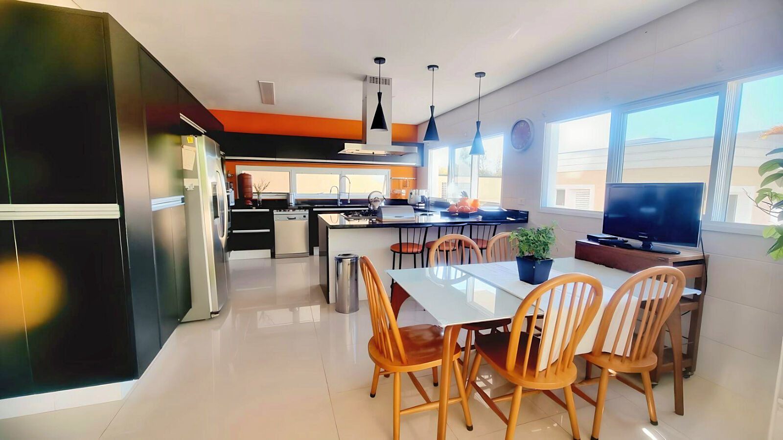 - Cozinha planejada e equipada (Florense) completa, fogão de ilha central, forno separado, geladeira grande, microondas, tampos em granito preto, pias de cuba dupla em aço inox.