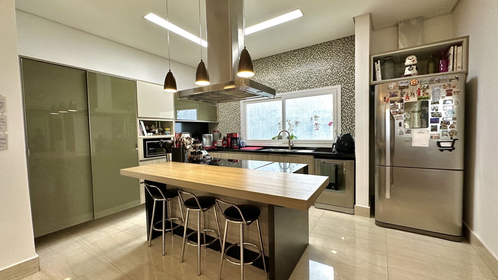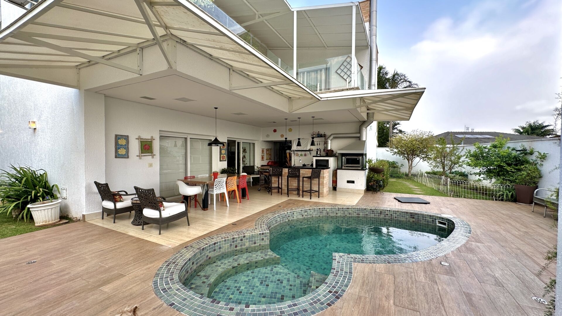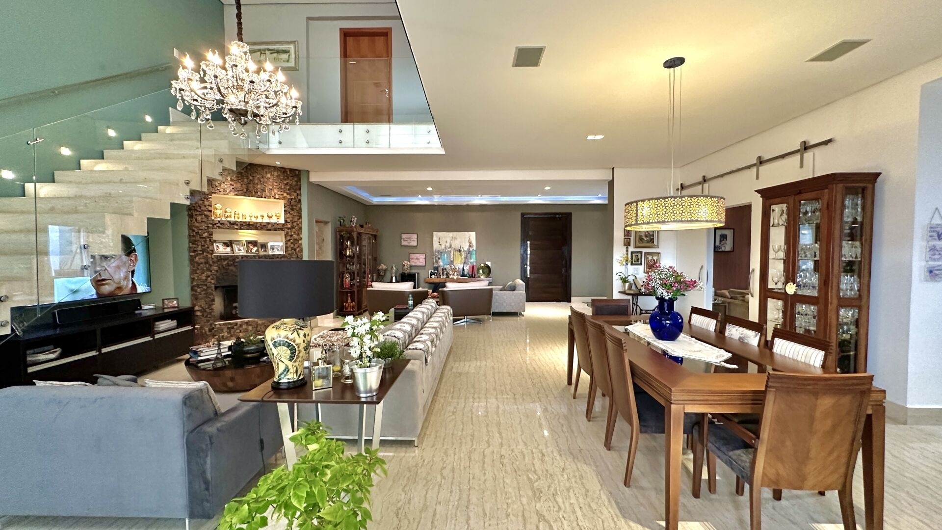 Amplo living para 3 ambientes, pé direito duplo, home theater, lavabo, lareira, lago de carpas integrado ao ambiente interno e 4 vagas de garagem