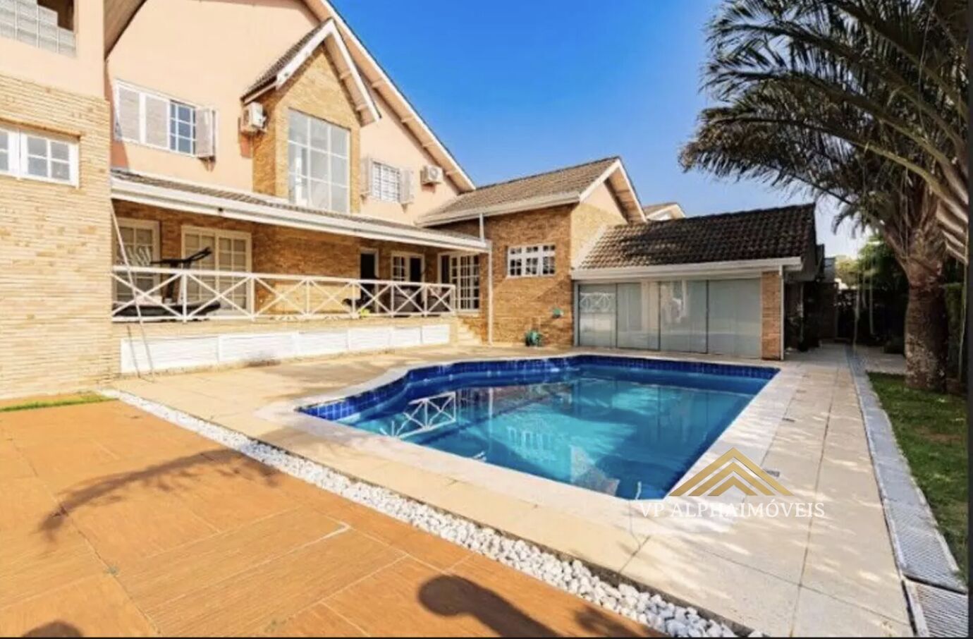 Área externa com gramado e piscina