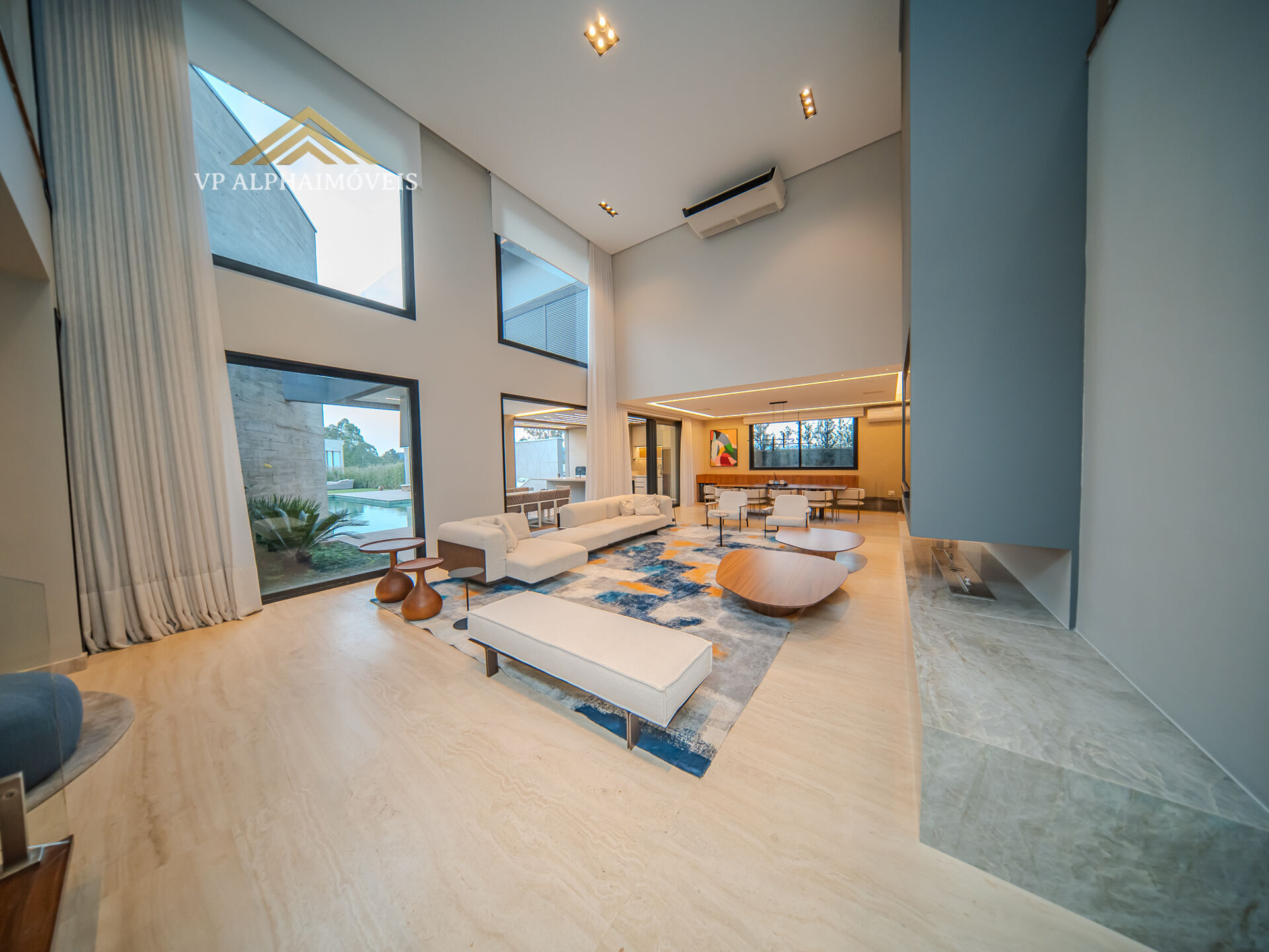 Sala ampla e integrada, com pé direito duplo, lareira também em mármore Taj Mahal cortinas automatizadas e completamente integrada a área gourmet.