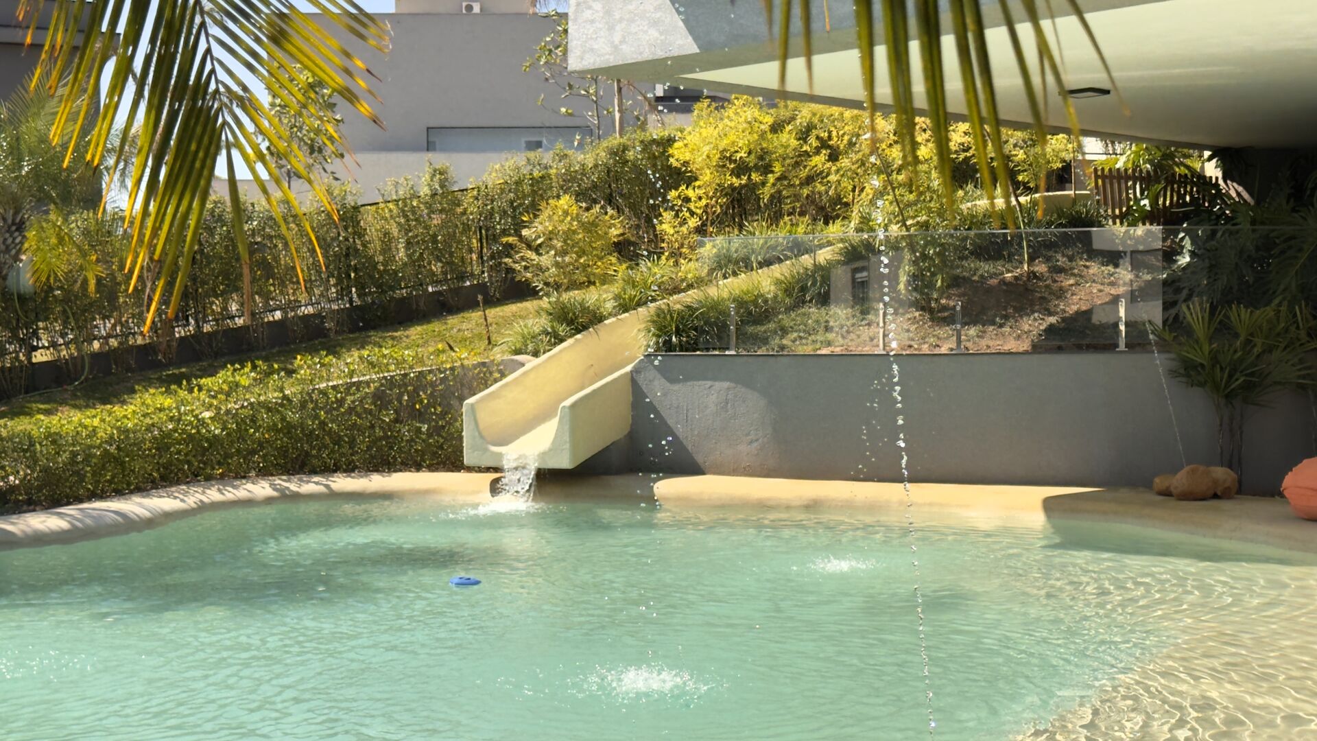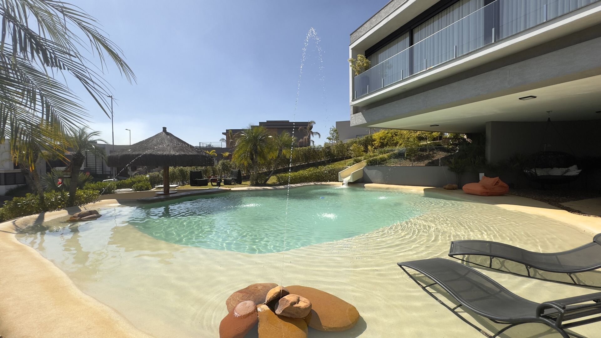 O destaque absoluto é a piscina natural, com quase 100m², tratada com ozônio, aquecida, com bar molhado, chafarizes e até um toboágua que garante diversão para todas as idades.