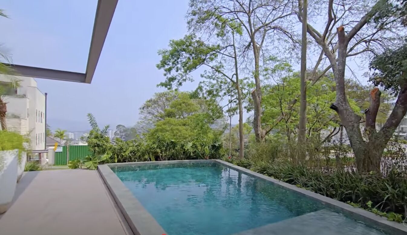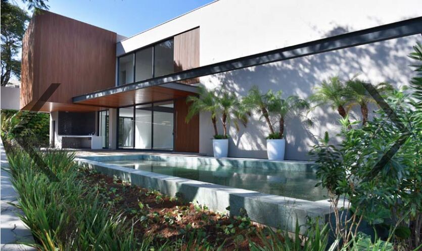 Janelas piso-teto em alumínio na cor grafite, portas de madeira piso-teto em laca branca, piscina revestida em porcelanato tipo "pedra palimanan" , banheiro máster com banheira de hidromassagem.