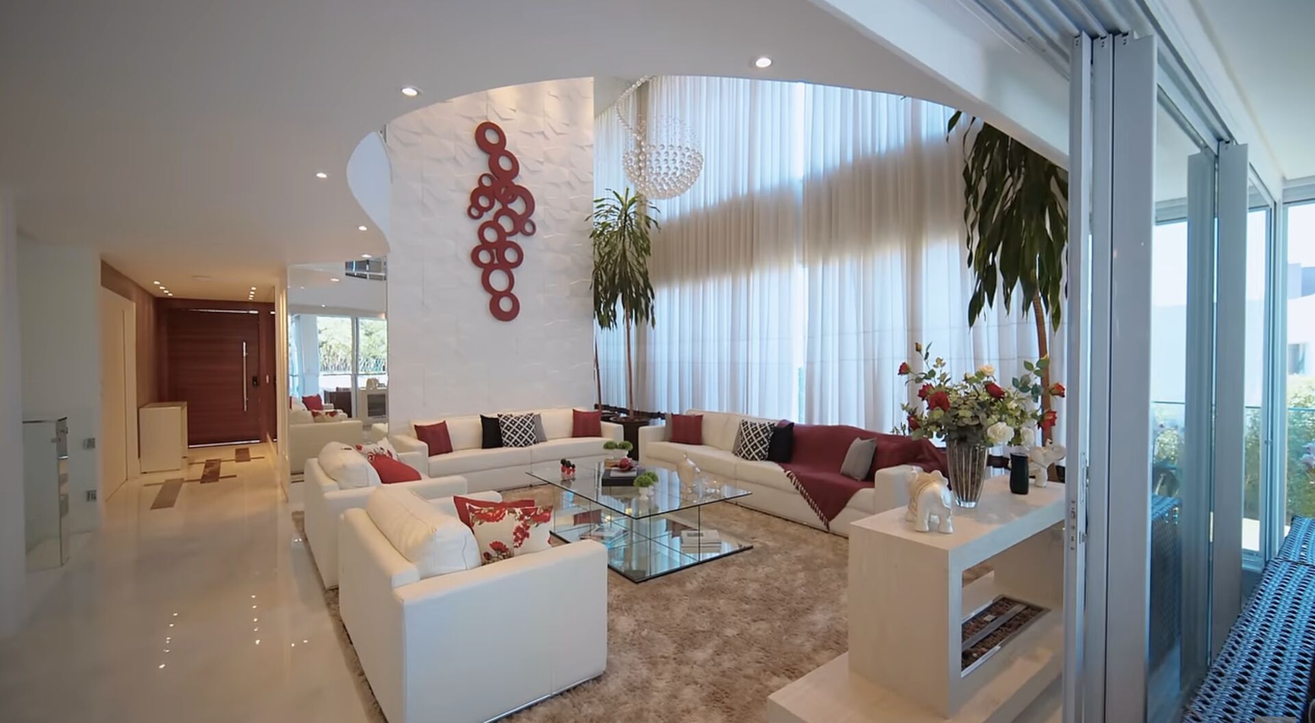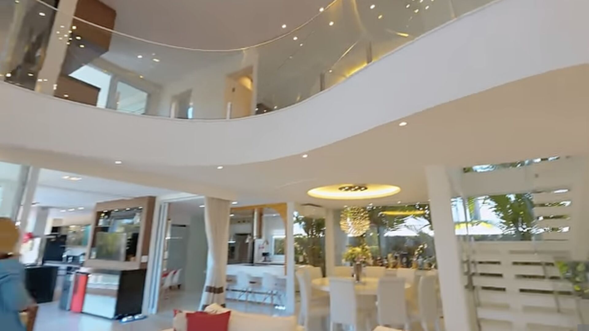 Sala estar com pé direito duplo e guarda corpo curvo no andar superior